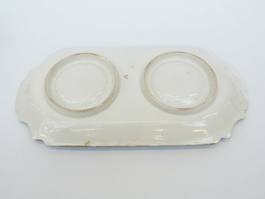 A 19thC porcelain double inkwell/ standish, the wells with leaf finials, probably Samson
