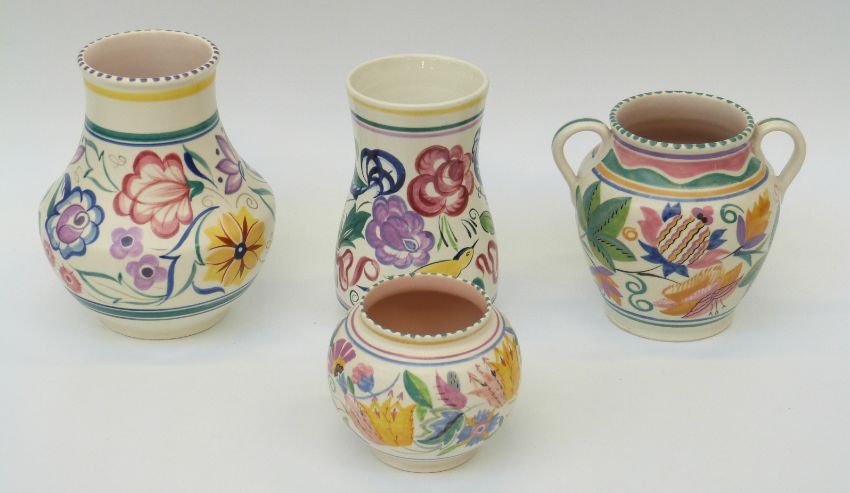 Four Poole pottery hand-painted vases, including an example with birds, two with impressed marks
