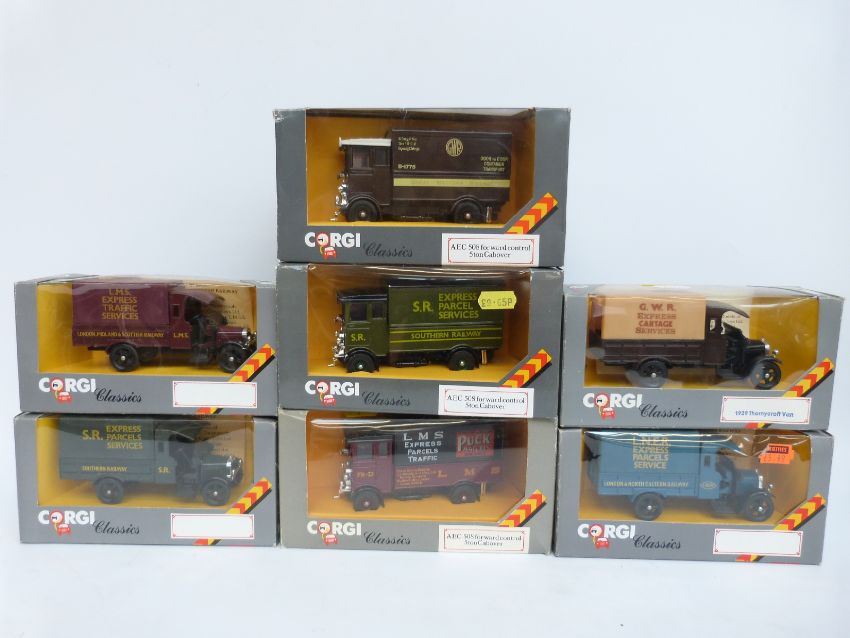Seven Corgi Classics diecast model railway delivery lorries including LNER, GWR, SR and LMS, all in original boxes