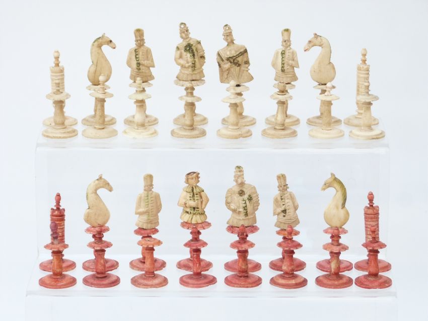 An 18thC German carved bone figural chess set with natural and stained red pieces, height of king 7cm.