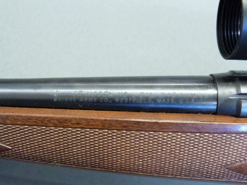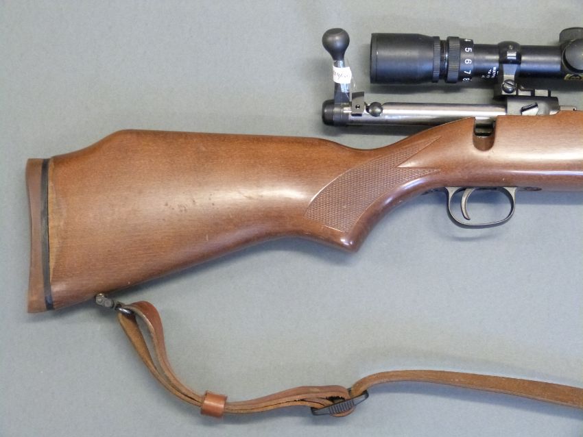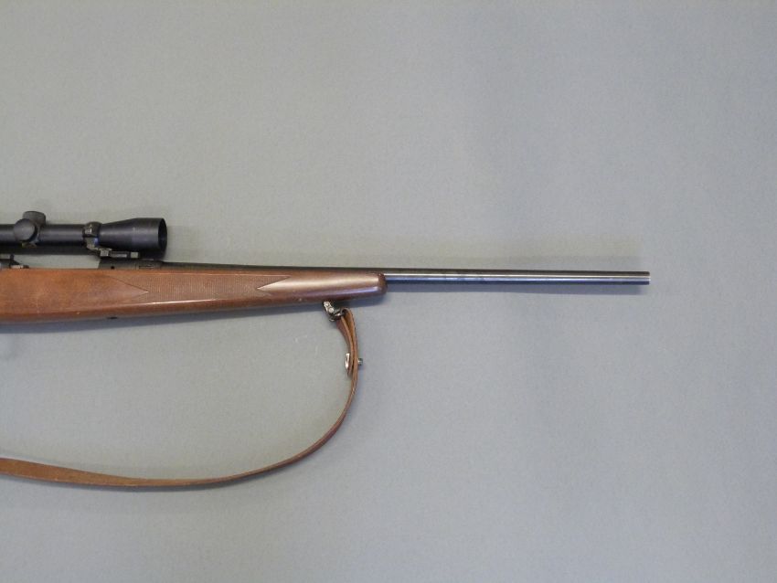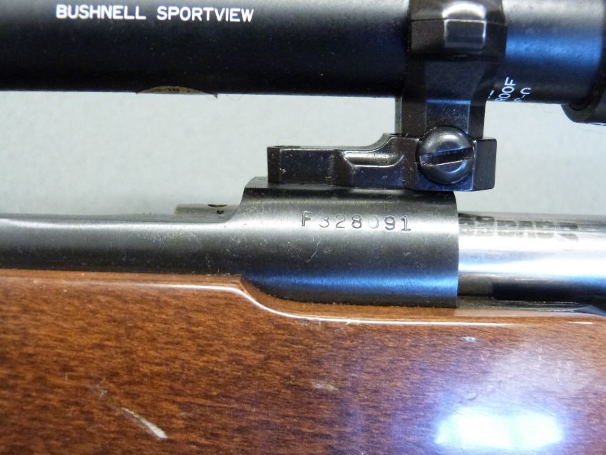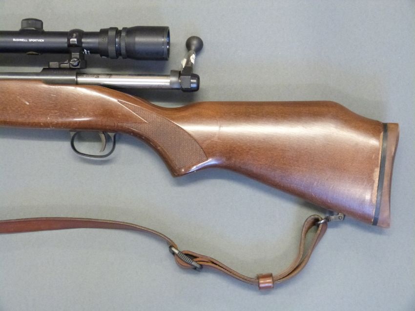 Savage model 14 .243 WIN bolt action rifle with chequered grip and forend, brown leather sling, Bushnell Sportview scope and 22.5 inch barrel, overall length 106.5cm, serial number F328091. PLEASE NOTE THAT A VALID RELEVANT FIREARMS/SHOTGUN CERTIFICATE IS REQUIRED TO HANDLE/PURCHASE THIS ITEM.