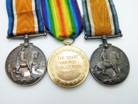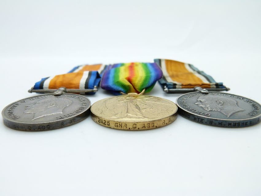 Three WWI medals, two named to 2825 Gunner C Agg, Royal Artillery comprising War and Victory Medal and a War Medal named to 40360 Pte W H Hughes Royal Welch Fusiliers