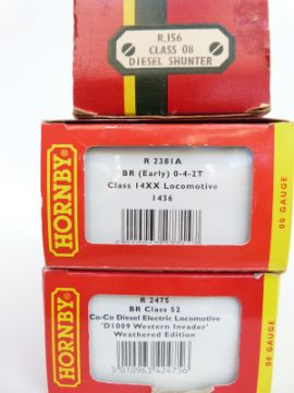 Three Hornby 00 gauge BR locomotives CO-CO Class 52 diesel electric Western Invader D1009 weathered edition R2475, 0-4-2-T Class 14XX tank 1436 R2381A and 0-6-0 Class 08 Diesel Shunter 13012 R156, all in original boxes