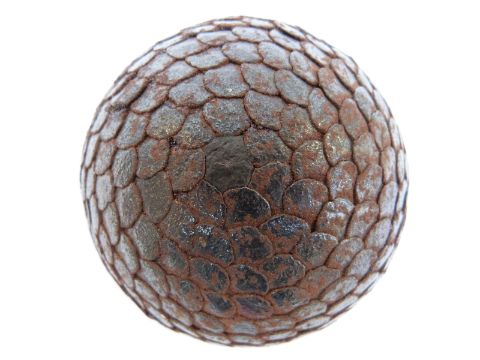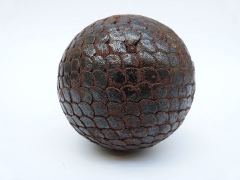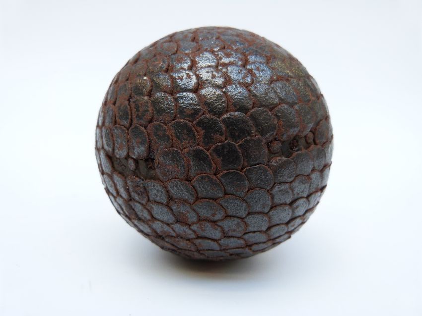 An antique boulle ball with overlapping hammered nail decoration, 8.5cm in diameter