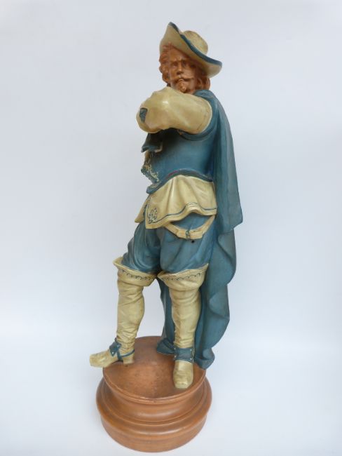 A large 19th/20thC pottery figure of a Cavalier on a terracotta base in Goldscheider style, impressed Gand SL to base and dated 1865, 67cm tall