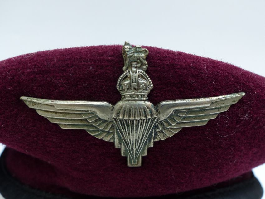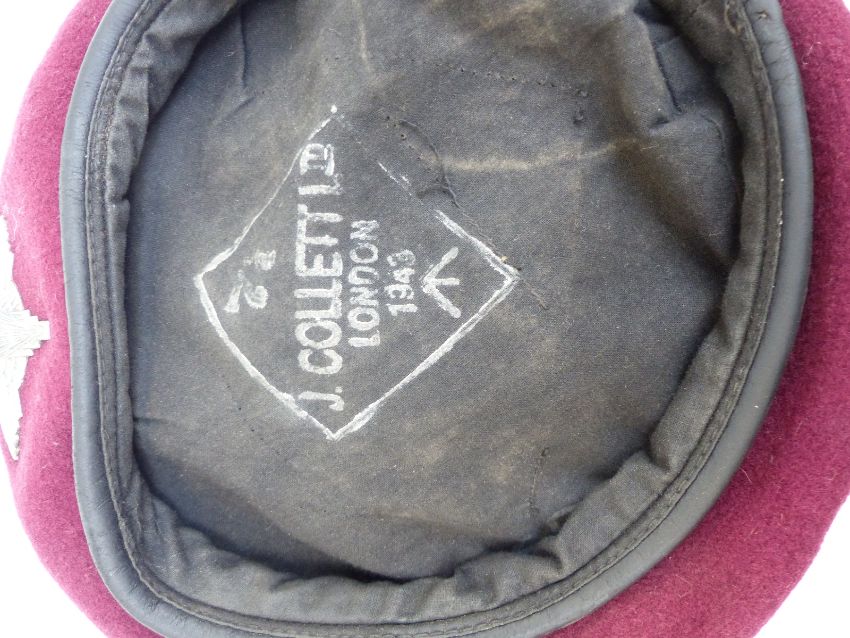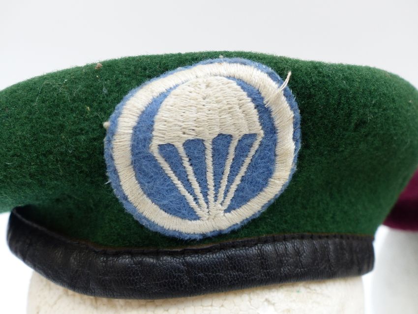 British Army Parachute Regiment beret and cap badge, beret marked J Collet Ltd, London 1943 together with a green beret with US Army Airborne Infantry cloth badge