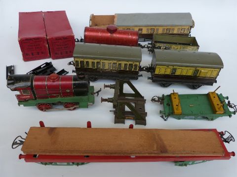 A quantity of Hornby and other 0 gauge rolling stock including three carriages, clockwork locomotive, four wagons, Hornby boxes etc