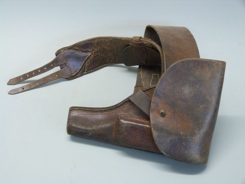 A brown leather pistol holster with magazine pouch, 28cm long, mounted on a belt.