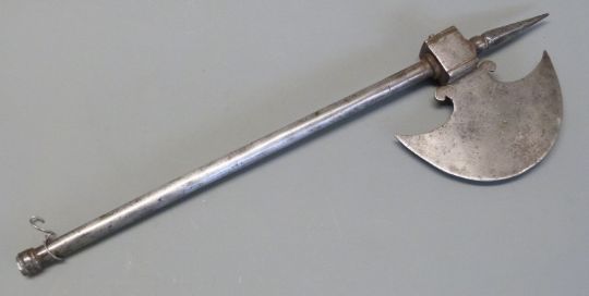 A 19thC Indian metal axe with swollen crescent shaped blade, central spike and square socket, 43.5cm long.