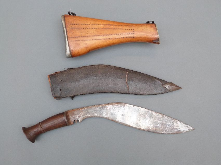 A cribbage board made from the butt of a .303 Lee Enfield rifle and a kukri