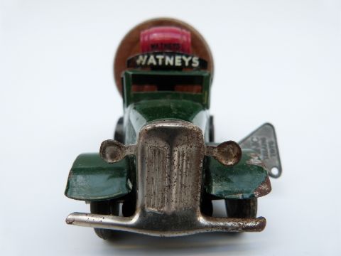 Tri-ang Minic clockwork tinplate Watneys Ale Delivery Lorry with green cab, red hubs, wooden barrel trailer and original key