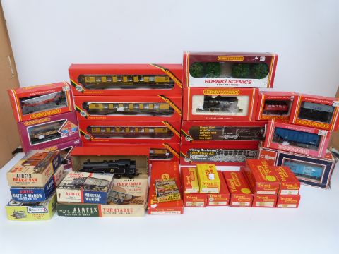 A quantity of Hornby, Tri-ang and Airfix 00 gauge railway goods wagons, including 2-6-2 tank loco, LMS tank locomotive 18 goods wagons, accessories etc