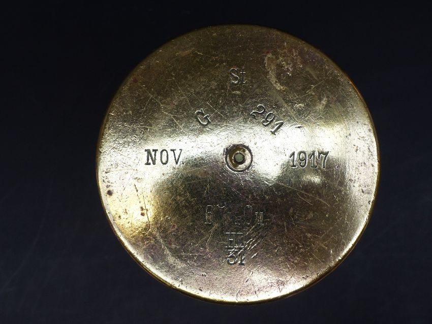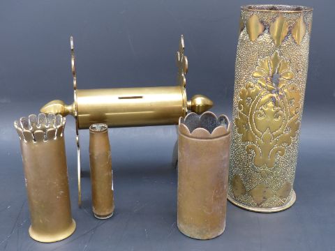 Five pieces of trench art, one in the form of a money box, one shell dated November 1917 to base