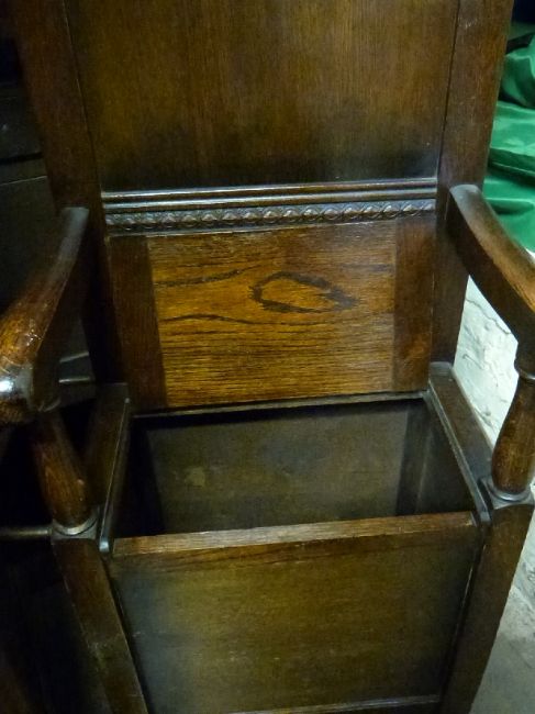 An Edwardian oak hall stand with inset bevelled oval mirror and built in lidded bench seat, height 194cm