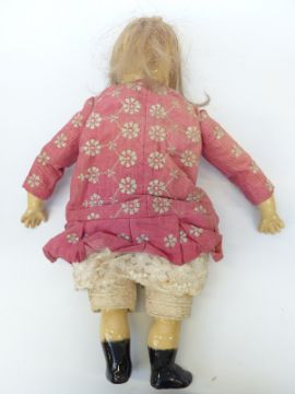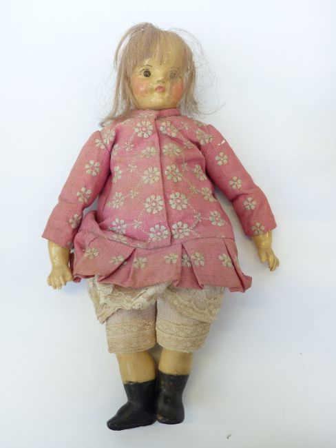 Two Teddy bears one Merrythought Wistful with brown mohair, shaved snout and jointed limbs, limited edition 41/2950 and Clement with brown/ blonde mohair and jointed limbs, both with original tags together with a porcelain doll with painted features, soft body and porcelain limbs, 36cm tall