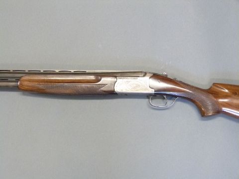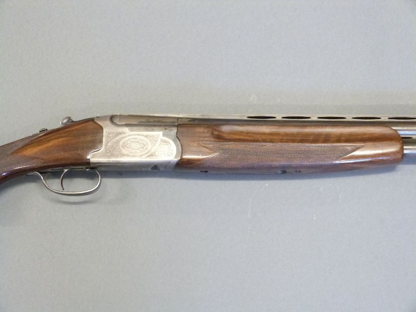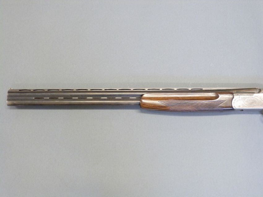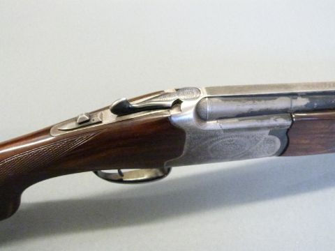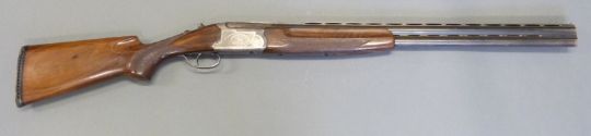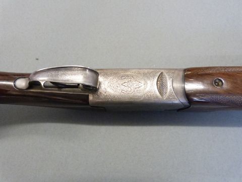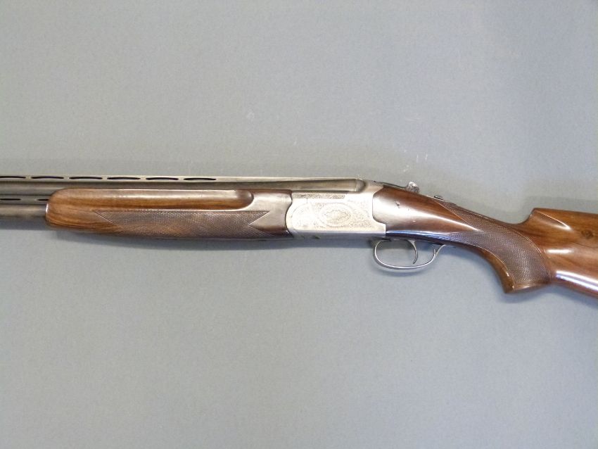 Lanber 12 bore over and under ejector shotgun with scrolling engraving to the lock, top lever and underside, chequered semi-pistol grip and forend, vented top and middle ribs, single trigger and 27.5" barrels, overall length 112.5cm, length of pull 36cm, serial number 158713. PLEASE NOTE THAT A VALID RELEVANT FIREARMS/SHOTGUN CERTIFICATE IS REQUIRED TO HANDLE/PURCHASE THIS ITEM.