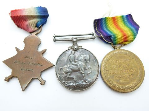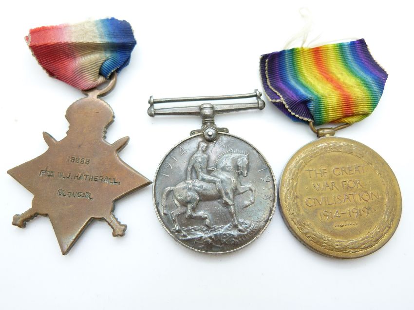 WWI medal trio named to 18888 Pte W.J.Hatheral Gloucester Regiment comprising 1914 / 1915 Star War medal and Victory medal