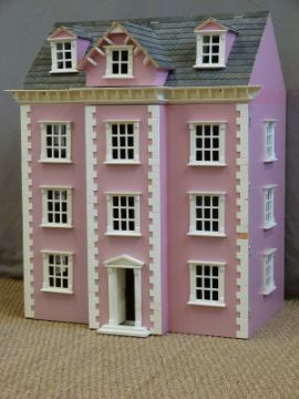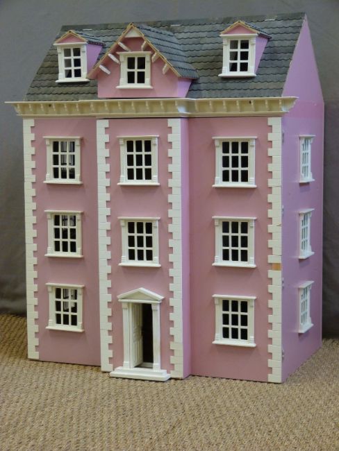 A fully furnished doll's house with pink exterior and slate roof, 85x73x50cm.