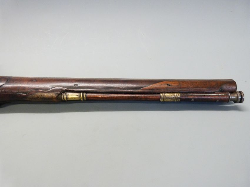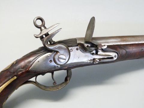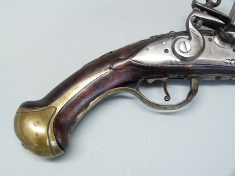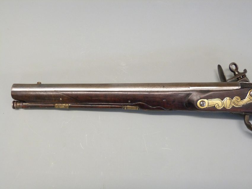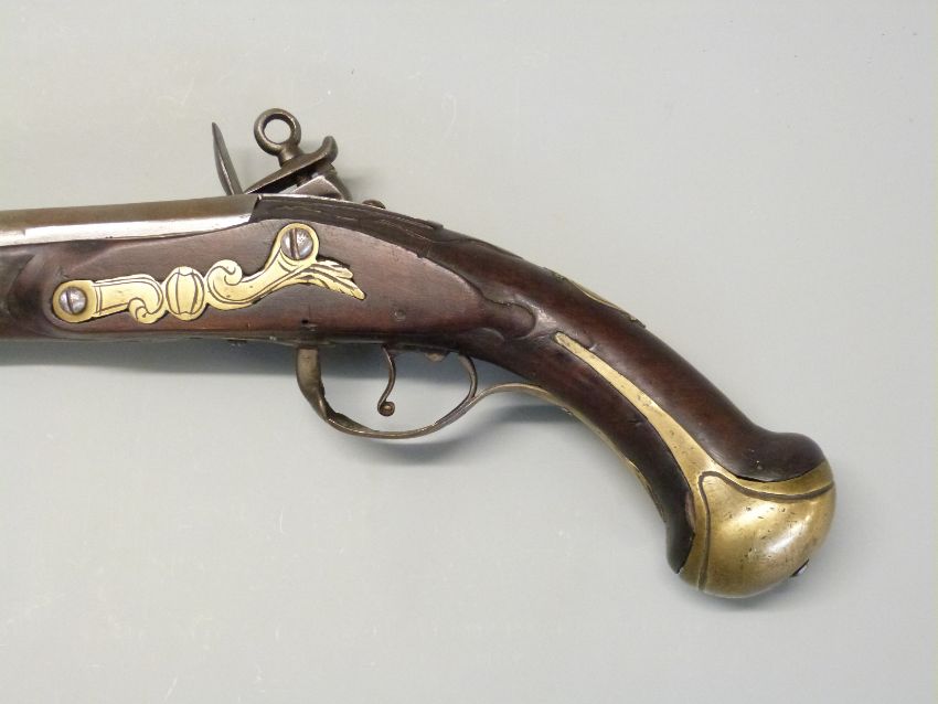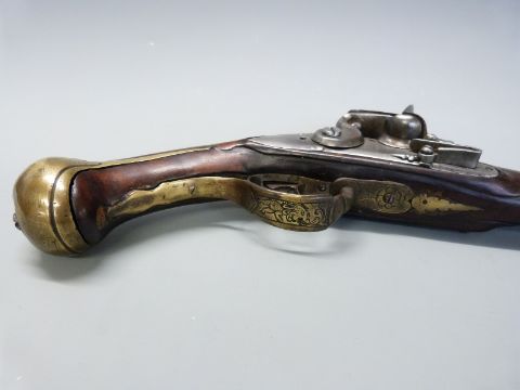Italian flintlock hammer action holster pistol with engraved dragon to the brass trigger guard, brass butt plate, wrist cartouche and mounts, steel tipped wooden ram-rod and 13.5 inch steel barrel, overall length 38cm.