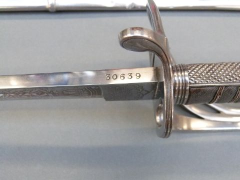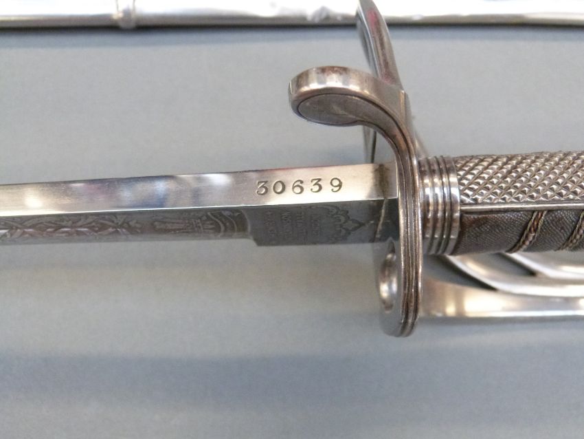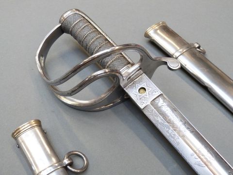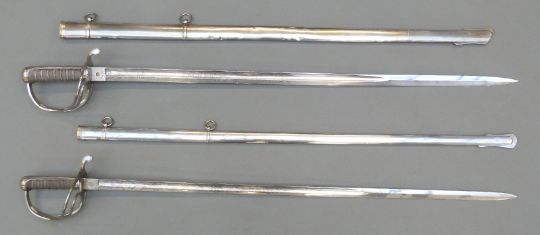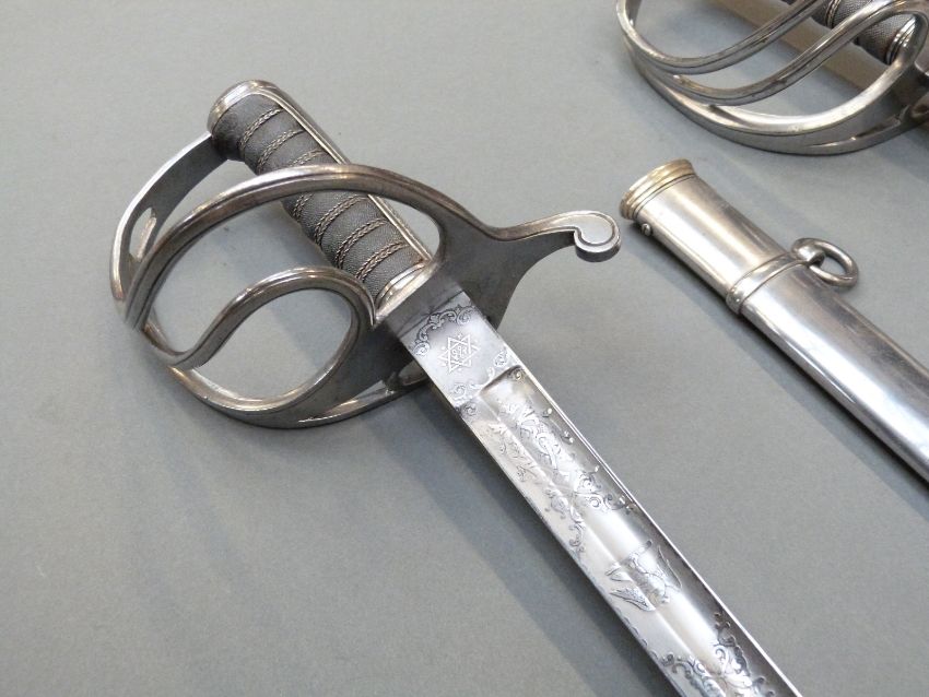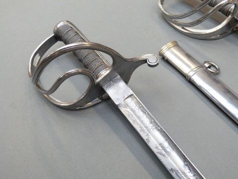 A pair of British 1821 Light Cavalry officer's swords by Wilkinson, Undress and Levee examples for the 10th Hussars, both with scabbards, blade lengths 86 and 88cm, one blade stamped 30639