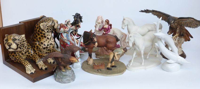 A collection of ceramic and resin figures including eagles, horses, leopard book ends, Franklin Mint etc
