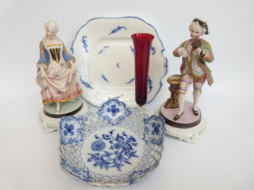 A Meissen sandwich plate, pair of German bisque figures etc