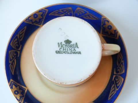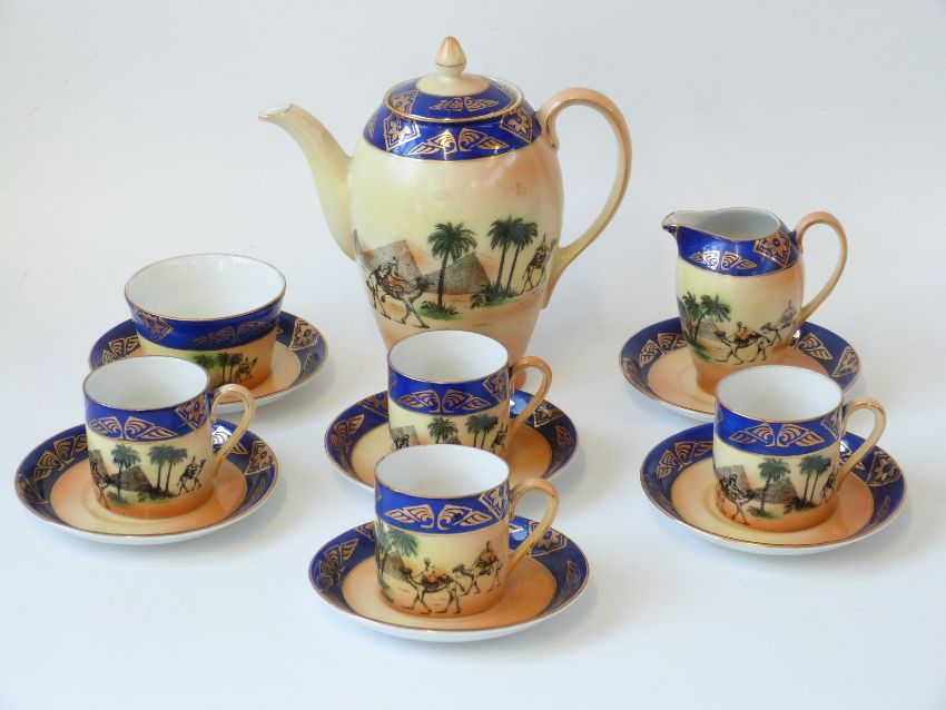 A Czechoslovakian Art Deco porcelain part coffee set decorated with desert scenes in the Noritake style