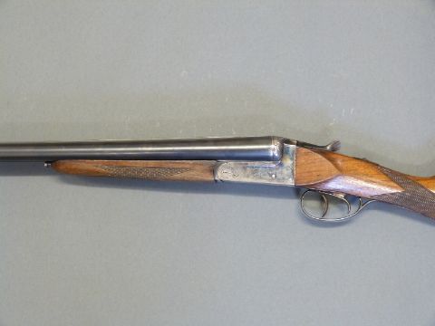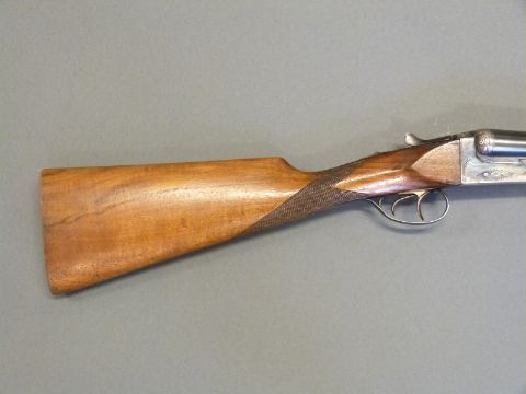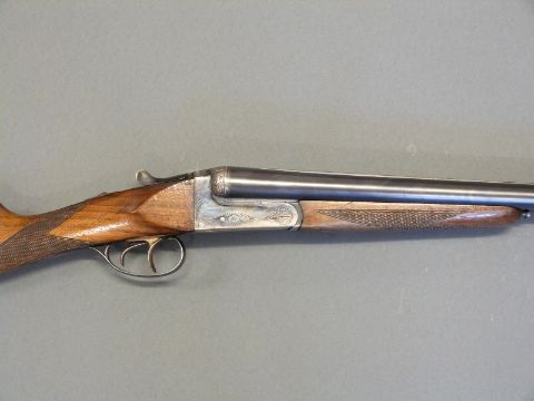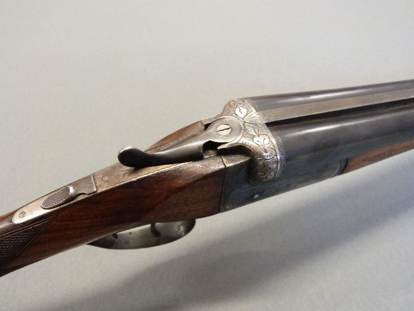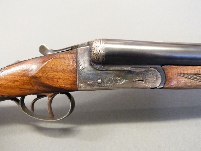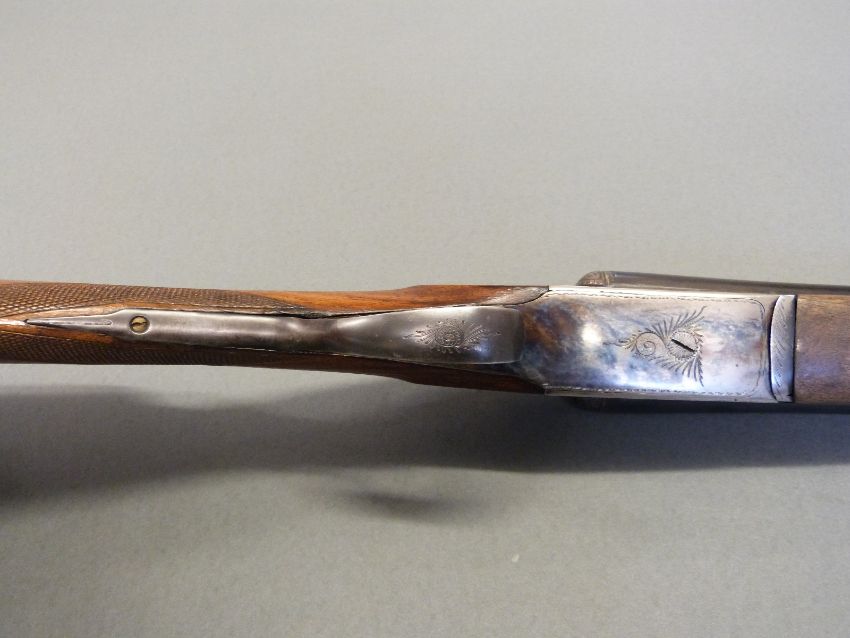 Miguel Labranga 12 bore side by side shotgun with engraved lock, top plate, underside and trigger guard, chequered grip and forend, double trigger and 28" barrels, overall length 113.5cm, length of pull 36.5cm, serial number 44597. PLEASE NOTE THAT A VALID RELEVANT FIREARMS/SHOTGUN CERTIFICATE IS REQUIRED TO HANDLE/PURCHASE THIS ITEM.