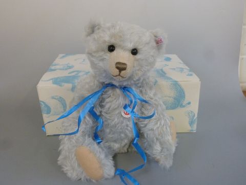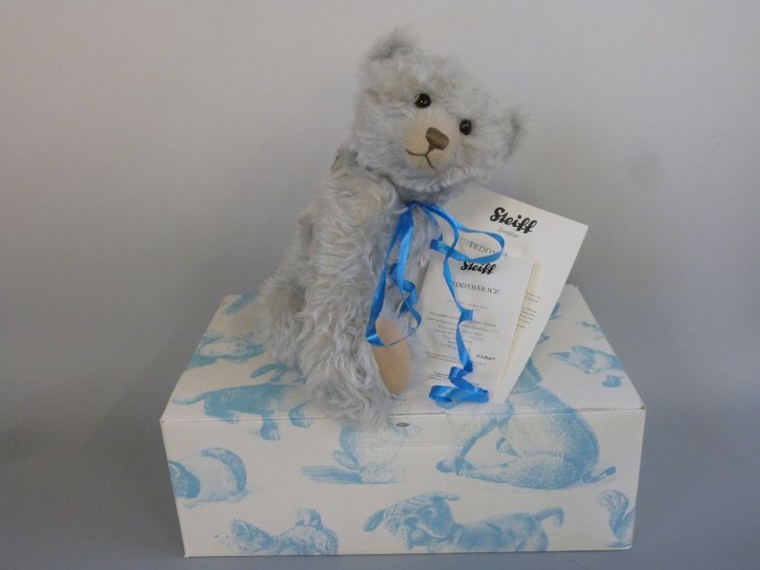 Steiff Teddy Bear Ice with light blue mohair, growler, shaved snout, blue ribbon and jointed limbs, limited edition 977/1500, 42cm tall, with box and certificate of authenticity