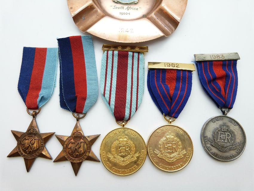 Two WWII medals both 1939 / 1945 Star, three Royal Military Police City of Chichester March medals 1982, 1983 and 1989 together with a Cambridge University Officer Training Corps presentation ashtray dated 1942