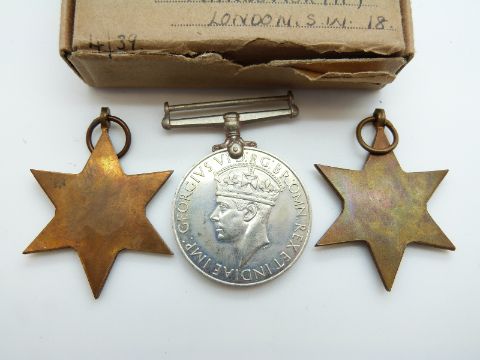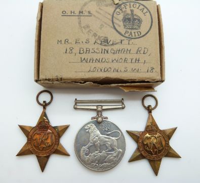 A group of three WWII medals in original box awarded to E S Levett, Middlesex Yeomanry
