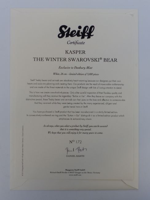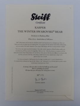 Steiff Teddy Bear Kasper the Winter Swarovski Bear with white mohair, gem set scarf and crystal set star, 26cm, limited edition 172/3000, with box and certificate of authenticity
