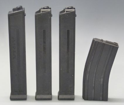 Four airsoft magazines comprising three G&G Armament AEG M16 mags and an Adventure Line curved magazine.