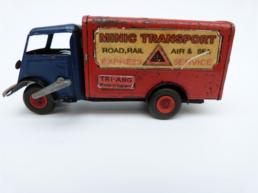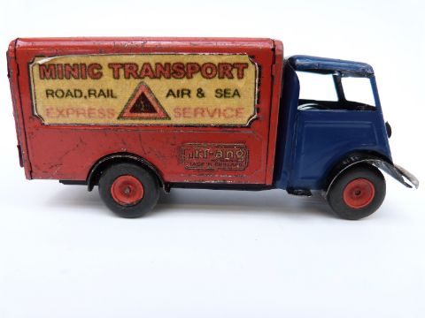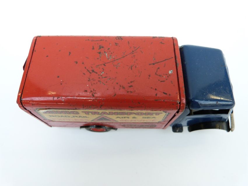 Tri-ang Minic clockwork tinplate Road Transport Delivery Lorry with blue cab, red body, red hubs and original key