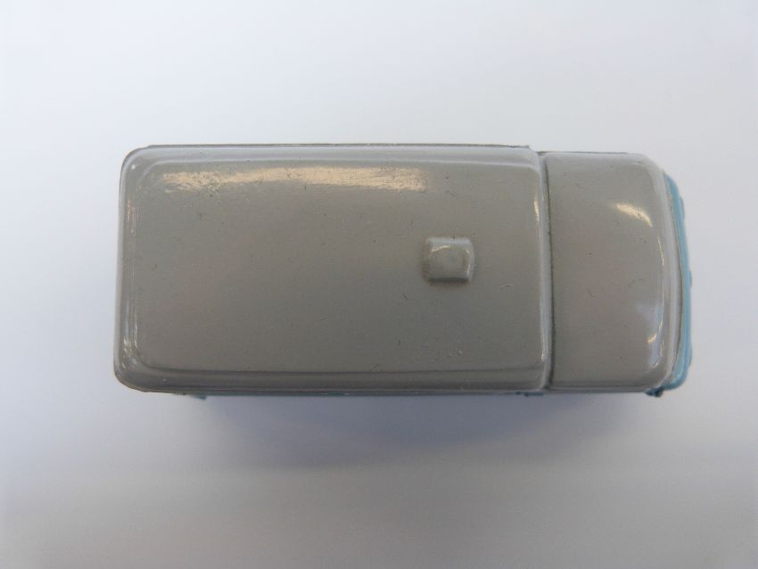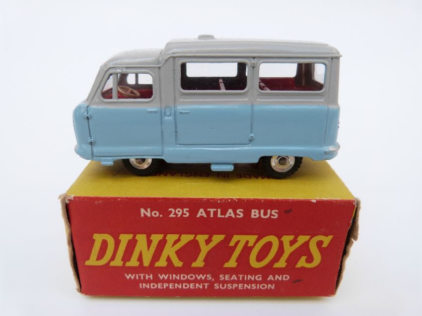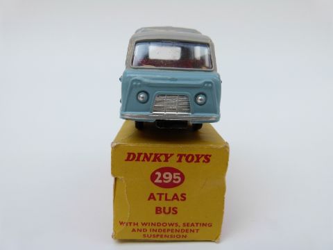 Dinky Toys diecast model Standard Atlas Autobus with pale blue and grey body, red interior and spun hubs 295, in original box.