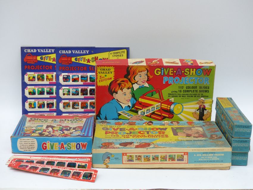 Three Chad Valley Give-a-Show projectors together with various sets of slides, all in original boxes