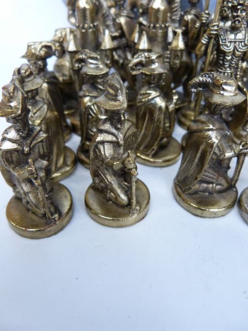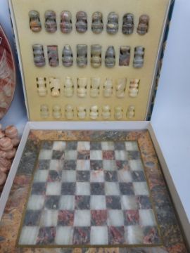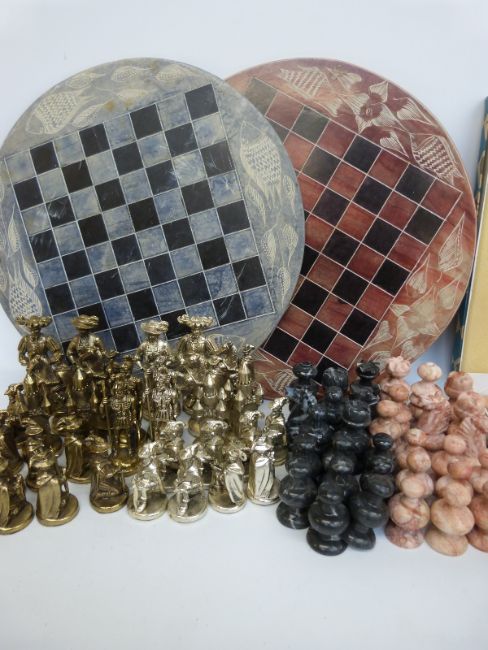Three various chess sets comprising two carved hardstone examples and one with cast metal Roman soldier figures, two on circular stone boards.