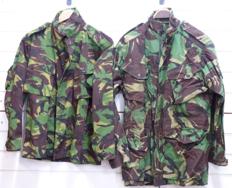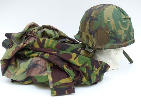 Kevlar camouflage helmet with two British camouflage jackets and one pair of camouflage trousers. Size medium