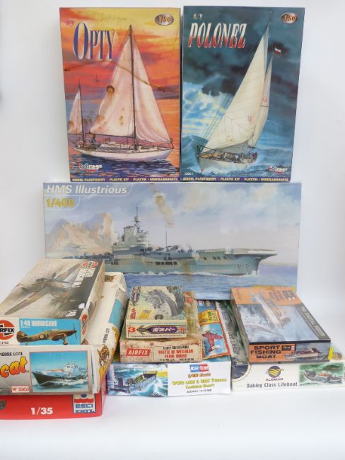 Eleven Airfix, Heller, ESCI and similar model boat and aeroplane kits including 1:400 scale HMS Illustrious, Oakley Class Lifeboat, Bobcat, Polonez, Opty etc, all in original boxes