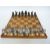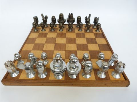 A steel chess set, each piece constructed from steel nuts and bolts, with wooden chess board, height of king 6.5cm.