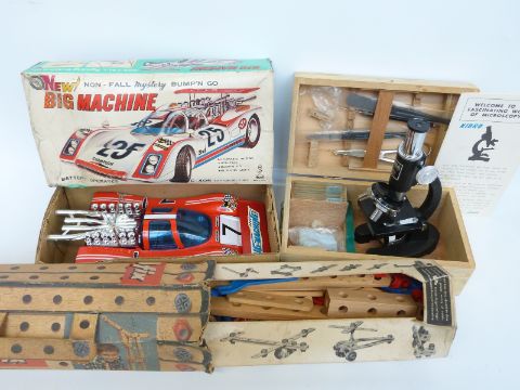 Bilofix Construction Kit together with a non-fall battery operated car and a children's microscope, all in original boxes.
