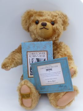 Merrythought Teddy bear Christopher Robin's Bear with blonde mohair and jointed limbs, limited edition 493/1924, 38cm tall, with certificate of authenticity and related booklet.