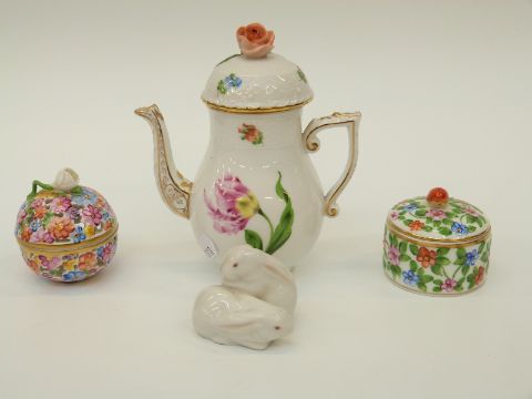 A collection of Herend porcelain to include a pierced, hand decorated lidded pot pourri pot, a hand decorated pot with strawberry finial, two white rabbits, miniature chocolate pot decorated with flora and gilt