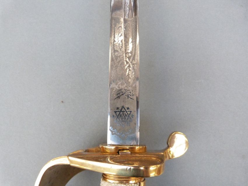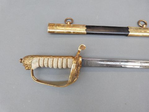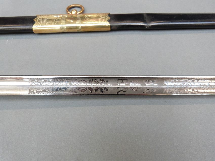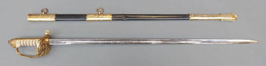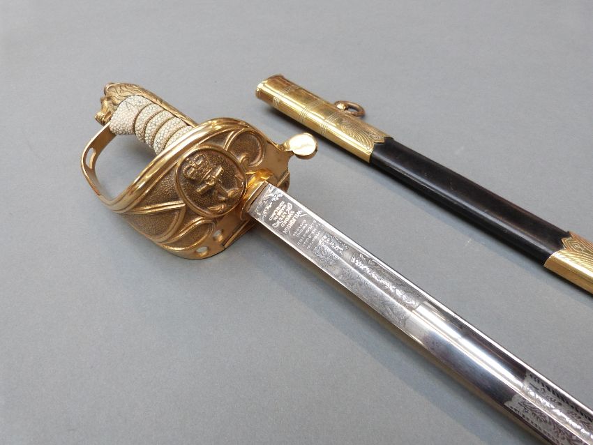 British 1827 pattern Naval Officer's sword by Wilkinson, serial number 91458 to blade and EIIR cypher, named R.A.Tole-Moir R.N, complete with leather scabbard, blade 78cm