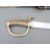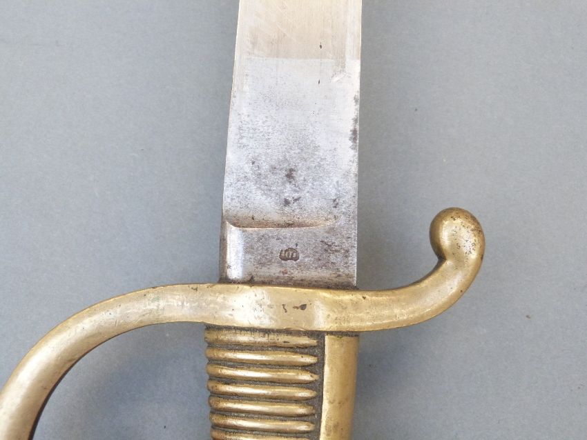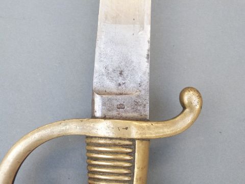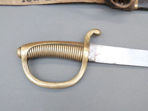 19thC French infantry briquet sword with heavy ribbed brass grip, guard stamped with crown and letter D and curved 60cm blade in leather scabbard with belt, marked 18H B48 1858