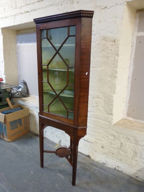 A 19thC astragal glazed mahogany corner cupboard on stand, height 193cm