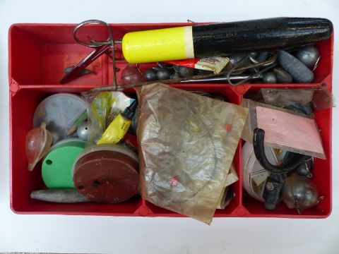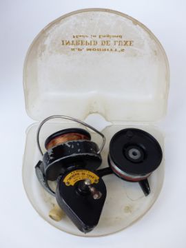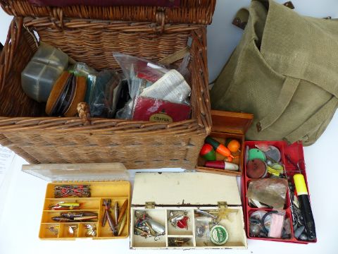 A collection of fishing equipment including a wicker basket, multiple fixed spool reels including 5100 Fisherman, Mitchell, Ambidex, J W Young, Centrepin etc, several shoulder bags, casts, lures, flies, further vintage accessories including a good collection of spring balances