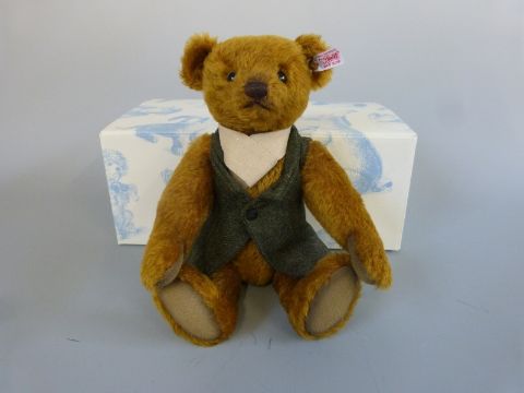 Steiff Teddy Bear Forrest with reddish blond mohair, tweed waistcoat, scarf and jointed limbs, limited edition 1413/1500, 30cm tall, with box and certificate of authenticity
