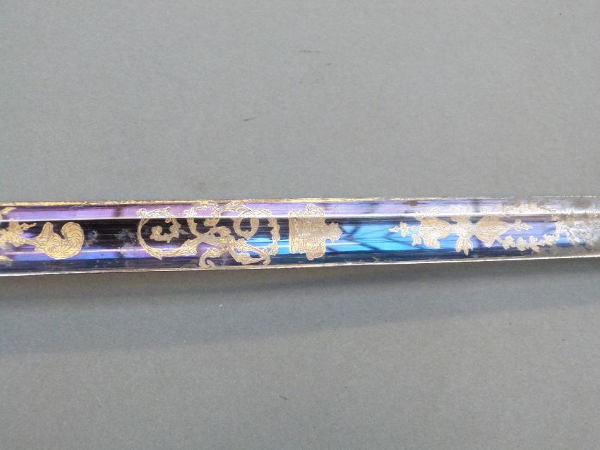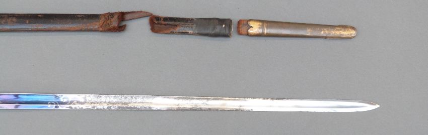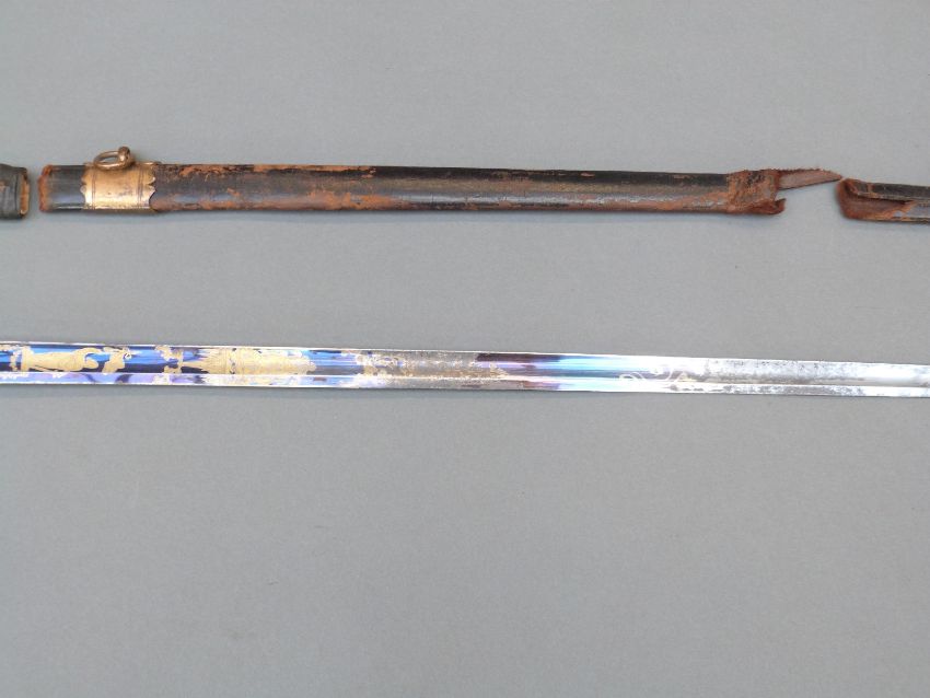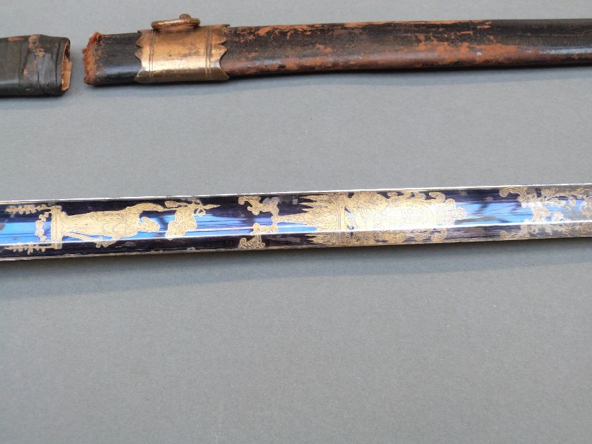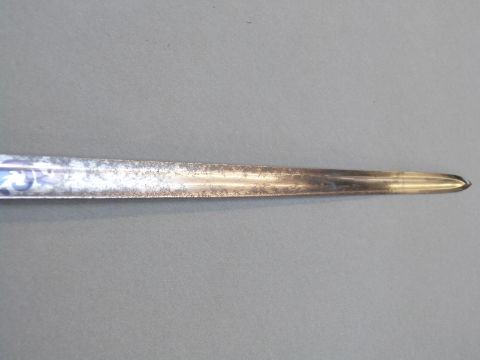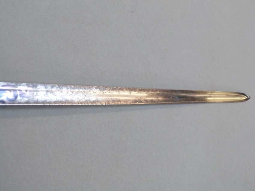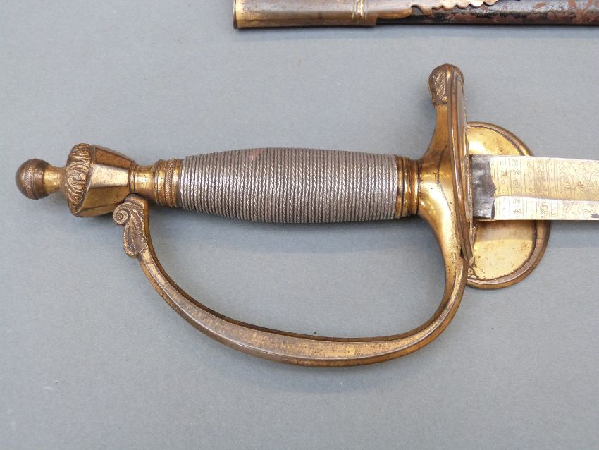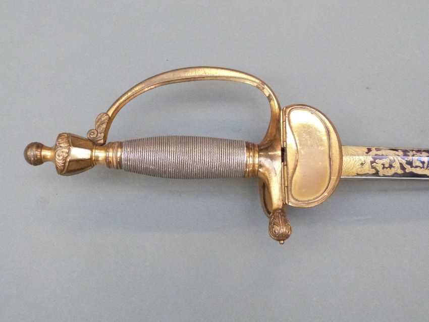 British 1796 pattern infantry officer's dress sword with parts of the original scabbard, the blued and gilded blade with engraved decoration, the folding guard with silver wire grip handle. Formerly the property of Major General Paul Anderson and acquired by the present owner from one of Anderson's descendants.Major General Paul Anderson was appointed Ensign in the 51st Foot on the 31st March 1788 and to Lieutenant on the 31st March 1791. In 1792 he went to Gibraltar and after staying there for two years he embarked for Toulon. He then went to Corsica, and was present at the storming of Convention redoubts, Mozelle Fort, and the siege of Calvi. On the 1st of July 1795 he was promoted to a company in the 4th West India Regiment. He was appointed Brigade Major to Sir J.Moore in the West Indies, and employed in the storming of Morne Chapot in St.Lucia, where he received a severe contusion in the side. He also was at the taking of Morne Fortunee, in repulsing the enemy's sortie, and in the final reduction of that place. He was employed during the whole of the brigand war under Sir J.Moore. He served in Ireland during the rebellion, and was present at the battle of Foukes Hill and the retaking of Wexford. He was appointed aide-de-camp to Sir J.Moore in the expedition to Holland, and was present at the first landing, and in the battles of the 10th of September and 2nd October.He also served as aide-de-camp to Sir J.Moore on the expedition to Egypt, and was present at the first landing, and in the battles of the 13th and 21st March. In the latter he received a shot in his right arm, which deprived him of full use of it, and obliged him to return home. On the 25th May 1796, he was removed from the 4th West India Regiment to a company in the 31st Foot; on the 25th June 1801 he was promoted to a Major in the 9th Foot, and on the 17th October 1805 obtained a Lieutenant-Colonelcy in the Nova Scotia Fencibles, from which he was removed to the 60th Foot on the 14th January 1808. He accompanied Sir J.Moore to Sicily in 1806 as Assistant Adjutant-General; and was appointed Deputy Adjutant-General to the army destined for Sweden; Assistant Adjutant-General to Sir J.Moore's division in Portugal; and Deputy Adjutant-General on Sir J.Moore being appointed Commander-in-Chief; and Commandant at head-quarters, in which situation he remained till the battle of Corunna. He next served as Assistant Adjutant-General to General Graham's division in the expedition to Walcheren, and was at the siege of Flushing. He served at Malta as Deputy Adjutant-General. He received the brevet of Colonel on the 4th June 1813, and Major-General on the 12th August 1819. He then went on half-pay on the 60th Foot.He was for twenty one years the friend and companion in arms of Sir John Moore