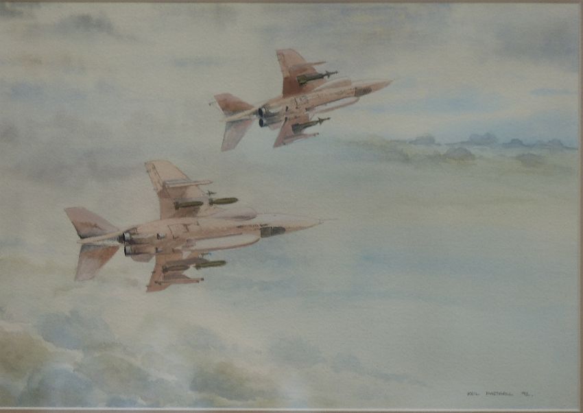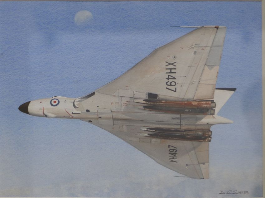 Four military aviation pictures and other loose examples, including watercolour of a V bomber by D.R.Smith, watercolour of two jet fighters in flight and a signed limited edition (10/250) print after Patricia Forrest